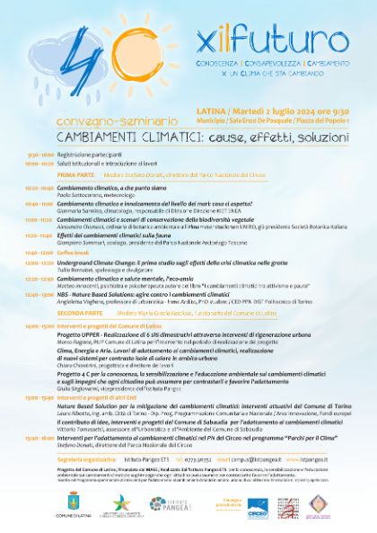 Martedì 2 luglio si svolgerà un convegno dal titolo “Cambiamenti climatici: cause, effetti, soluzioni”. L’evento è organizzato dal Comune di Latina ed ha il patrocinio dell’ordine degli architetti, degli ingegneri e del Parco Nazionale del Circeo.